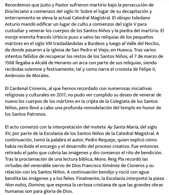 El nuevo grupo escultórico rinde homenaje a Fray Francisco Ximénez de Cisneros, del que acaba de cumplirse el V centenario de su muerte (1517-2017), así como a los santos patronos de Alcalá de Henares y titulares de la Iglesia Magistral Catedral, los santos niños Justo y Pastor, con ocasión del 450 aniversario de la “reversión” o regreso de sus reliquias a la cripta del templo complutense, que se cumplirá el próximo 7 de marzo (1568-2018).